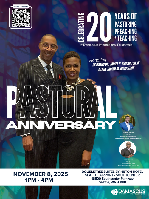 Join us for our celebration honoring Reverend Dr. James P. Broughton, III & Lady Tammi Broughton at an anniversary luncheon on Saturday November 8, 2025. Festivities will be held at the Double Tree Hotel in Southcenter.